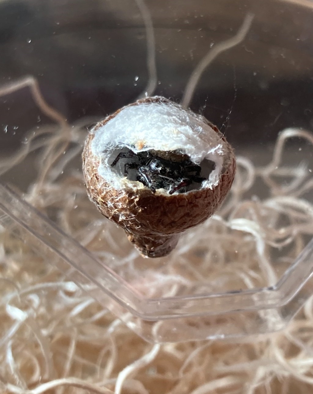 11/30/2024- Came home from Thanksgiving trip to find spiderlings emerging! Moved them into a container as recommended here. Put coconut fiber on the bottom and covered with a paper towel, then added excelsior. Hoping this helps keep the humidity at acceptable levels. This is a desert species so I’m not sure how high it needs to be.