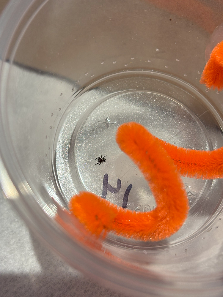Dec 14, 2024- Saw one spiderling have a go at another, so I figured it was time to split them into the deli cups, or at least thin the numbers. Moved 11 out of 21 into cups.