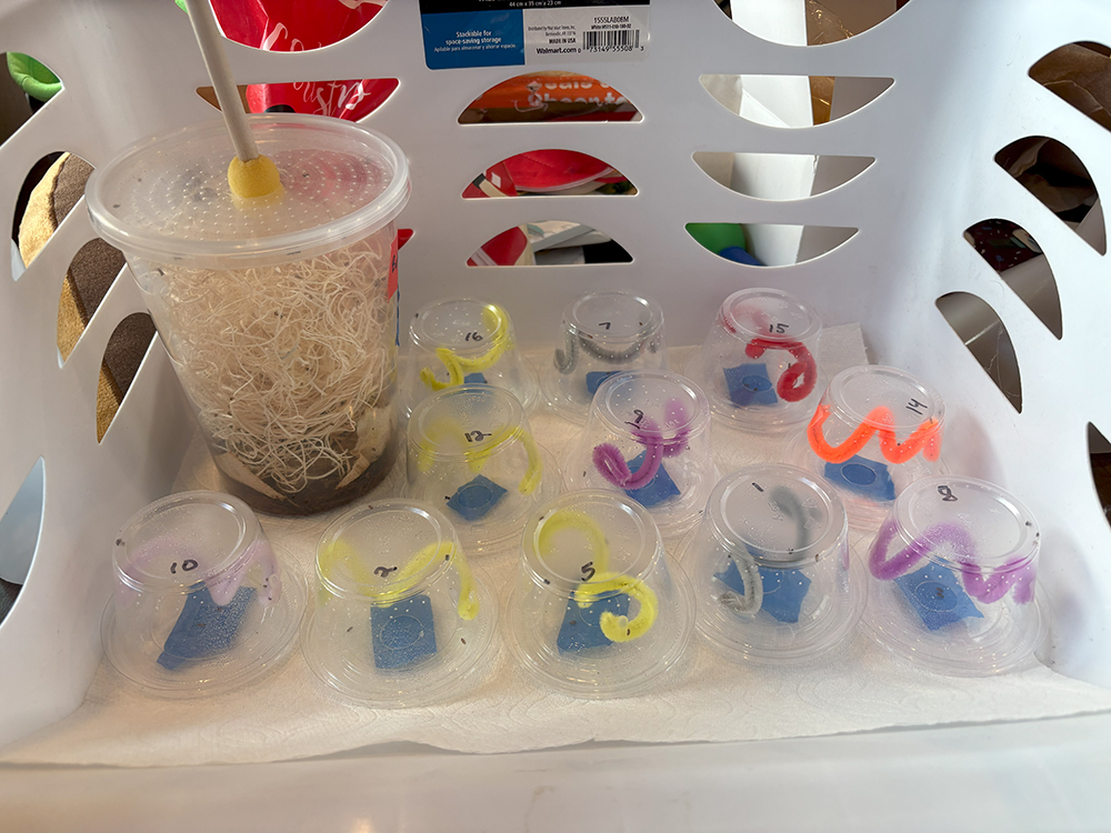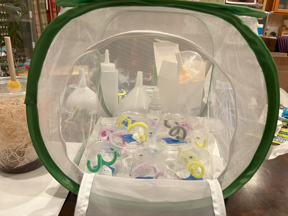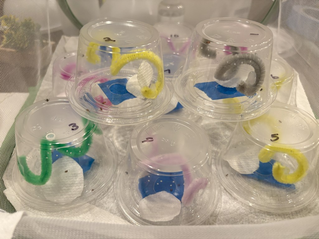 At first I was feeding them inside a butterfly enclosure because I didn’t want fruit flies getting loose, but it didn’t end up being an issue. I highly recommend getting wingless flightless fruit flies as they’re just so much slower. The flightless winged can jump pretty far. I use a funnel and tap the flies into a condiment container, then use that bottle to squeeze a few into each deli cup. Easy!